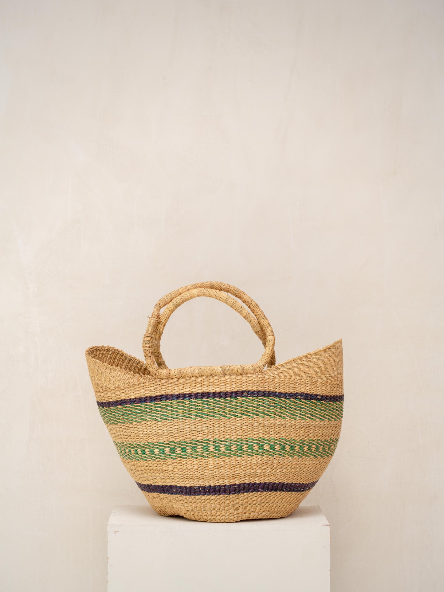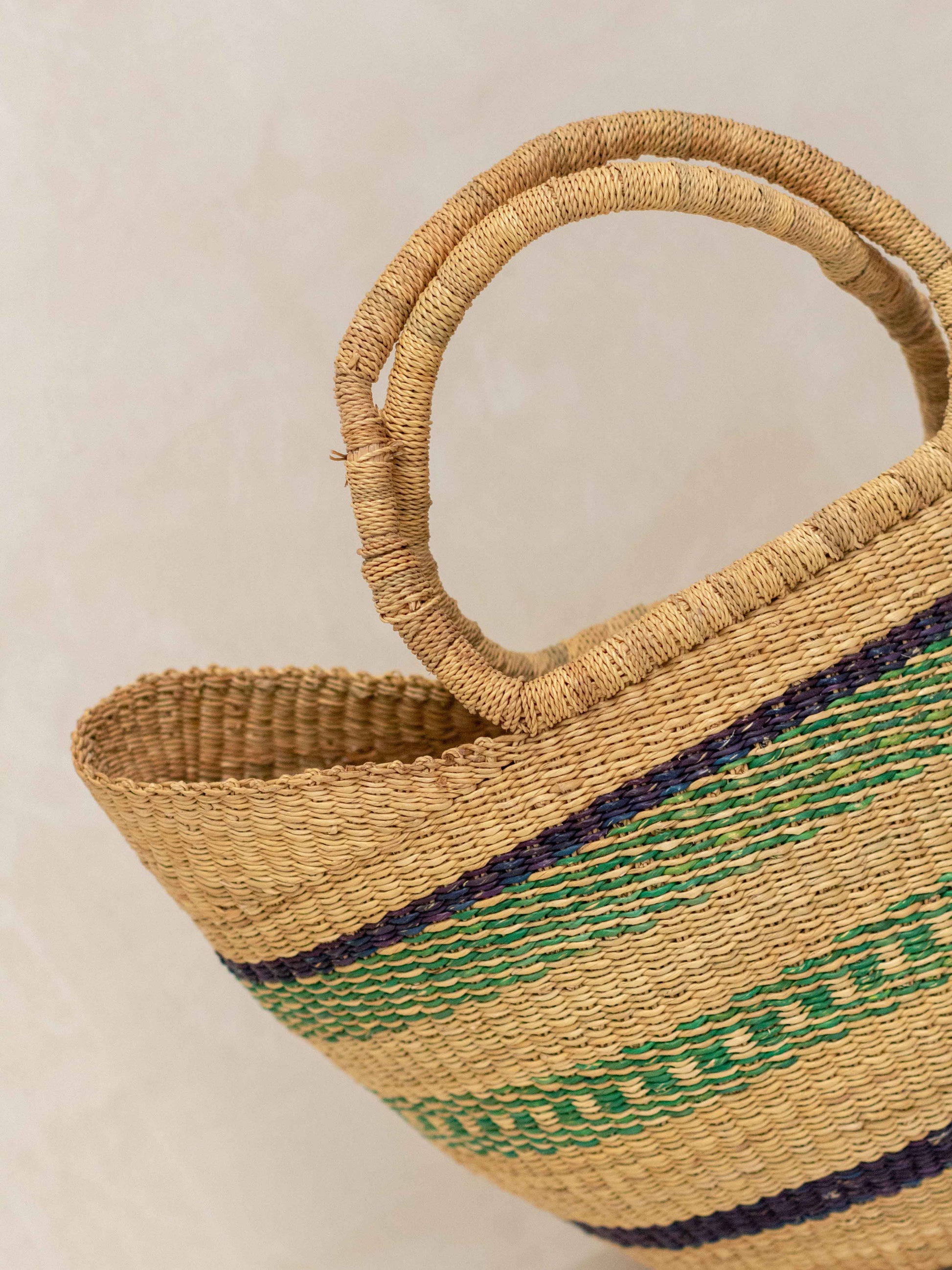 Without a doubt one of our bestsellers when it arrives in good time. It is a basket woven by artisan women in the city of Bolgatanga, Ghana. It is handwoven in elephant grass , a hardy variety of grass that is dyed to create these colorful designs.