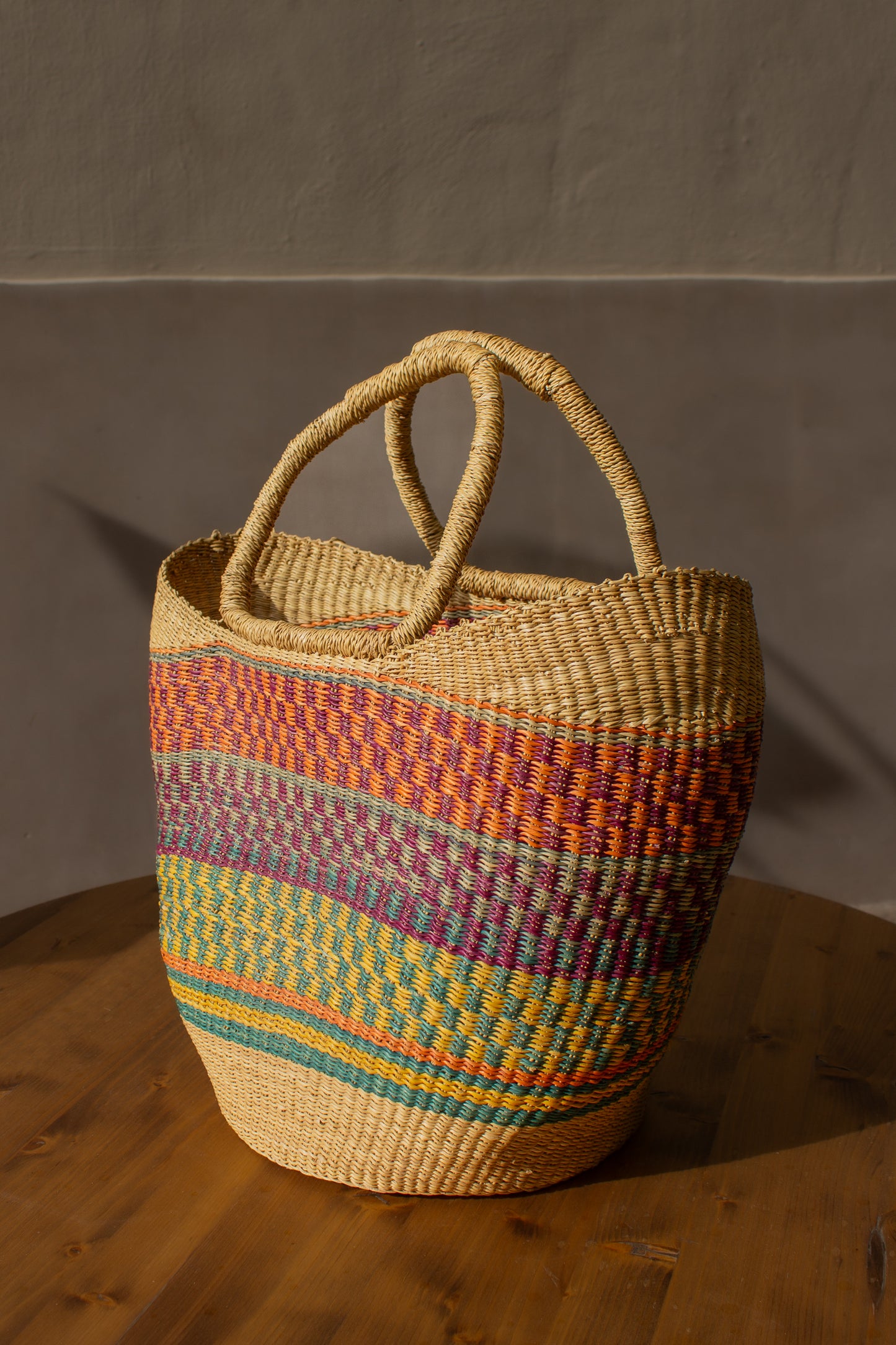 Without a doubt one of our bestsellers when it arrives in good time. It is a basket woven by artisan women in the city of Bolgatanga, Ghana. It is handwoven in elephant grass , a hardy variety of grass that is dyed to create these colorful designs.