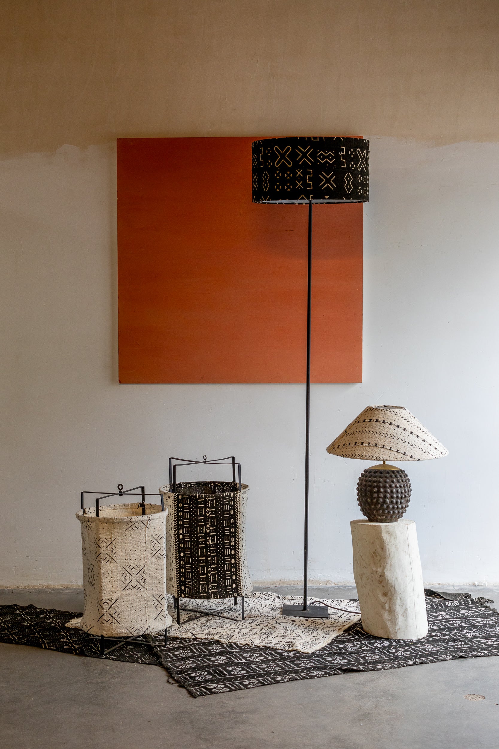 All our lampshades are made in Spain with our African fabrics. This cylindrical screen is made with a bogolan fabric. This type of fabric is made with elongated strips of cotton that are previously woven in a traditional way and then sewn together. Once finished, the fabric is cooked by mixing it with macerated leaves as a vegetable dye.