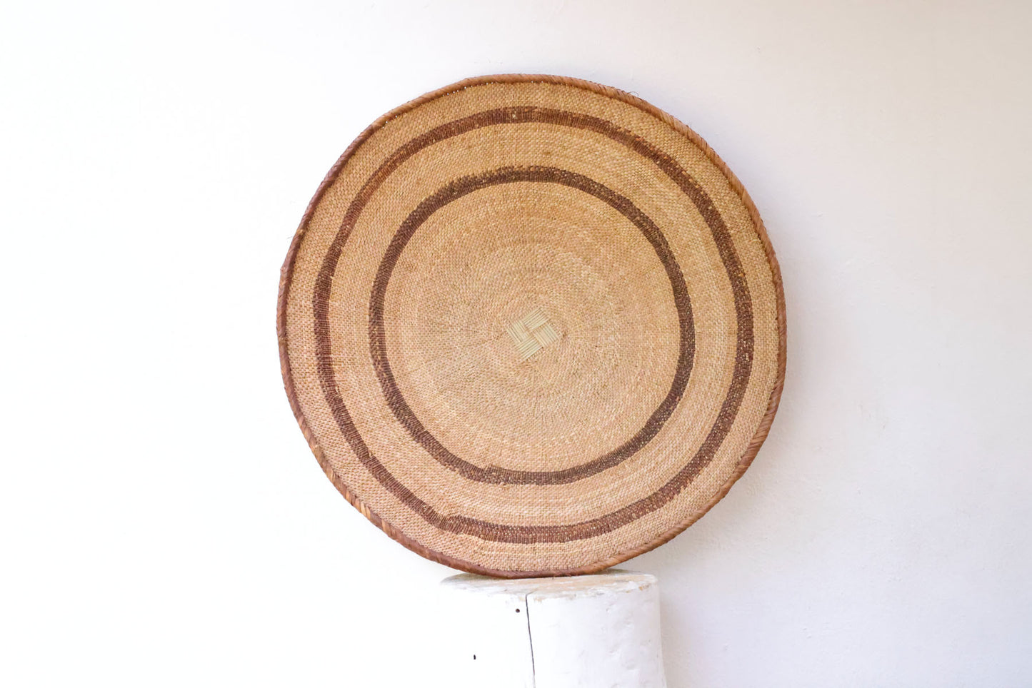 To weave a Binga plate, it starts with a characteristic square base divided into four parts, then continues with a simple weave, finally finished off with a spiral fiber edge with a distinctive design.