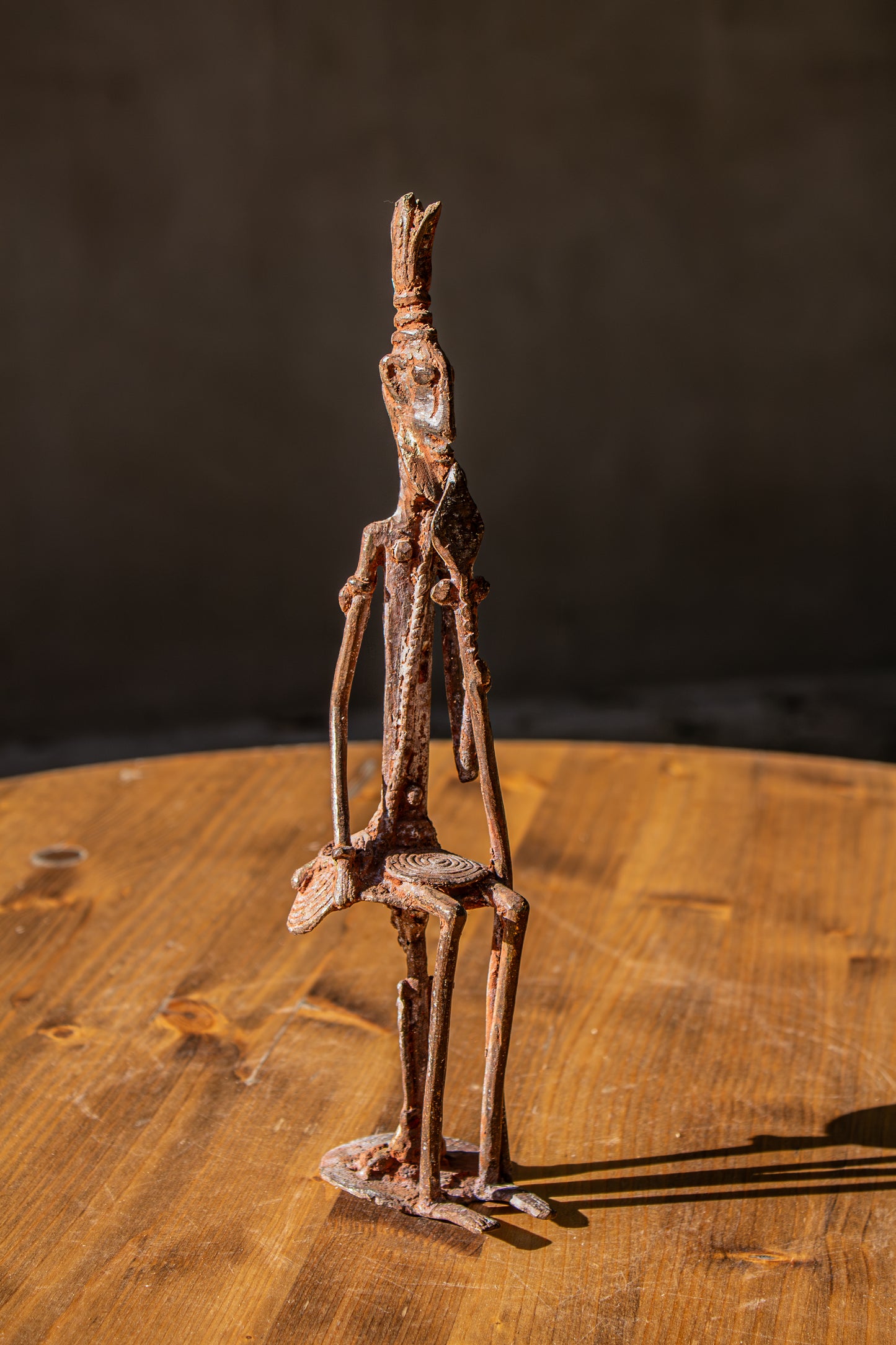 The artist sculpts or works a small figure in wax, until the desired shape is achieved. In the upper part, several ducts also made of wax are fixed; the artist covers the interior and exterior with wet refractory clay or mud and tries to make the external layer thicker, to give the whole a greater solidity. It is left to dry in the sun or in an oven, depending on the greater or lesser degree of technique achieved by the artist. When it has dried well, he heats the piece to melt the wax and a vacuum is left into which the molten metal is introduced. The metal extends to occupy all the nooks and crannies of the mold. Two holes are made, one through which the bronze or molten metal is poured and another through which the wax escapes, which will be covered at the appropriate time, allowing the mold to cool down afterwards. Once cold, the mold is broken and the figure obtained will be finished with a chisel or other incisive instruments, achieving figures as special as those we have in Sankore.