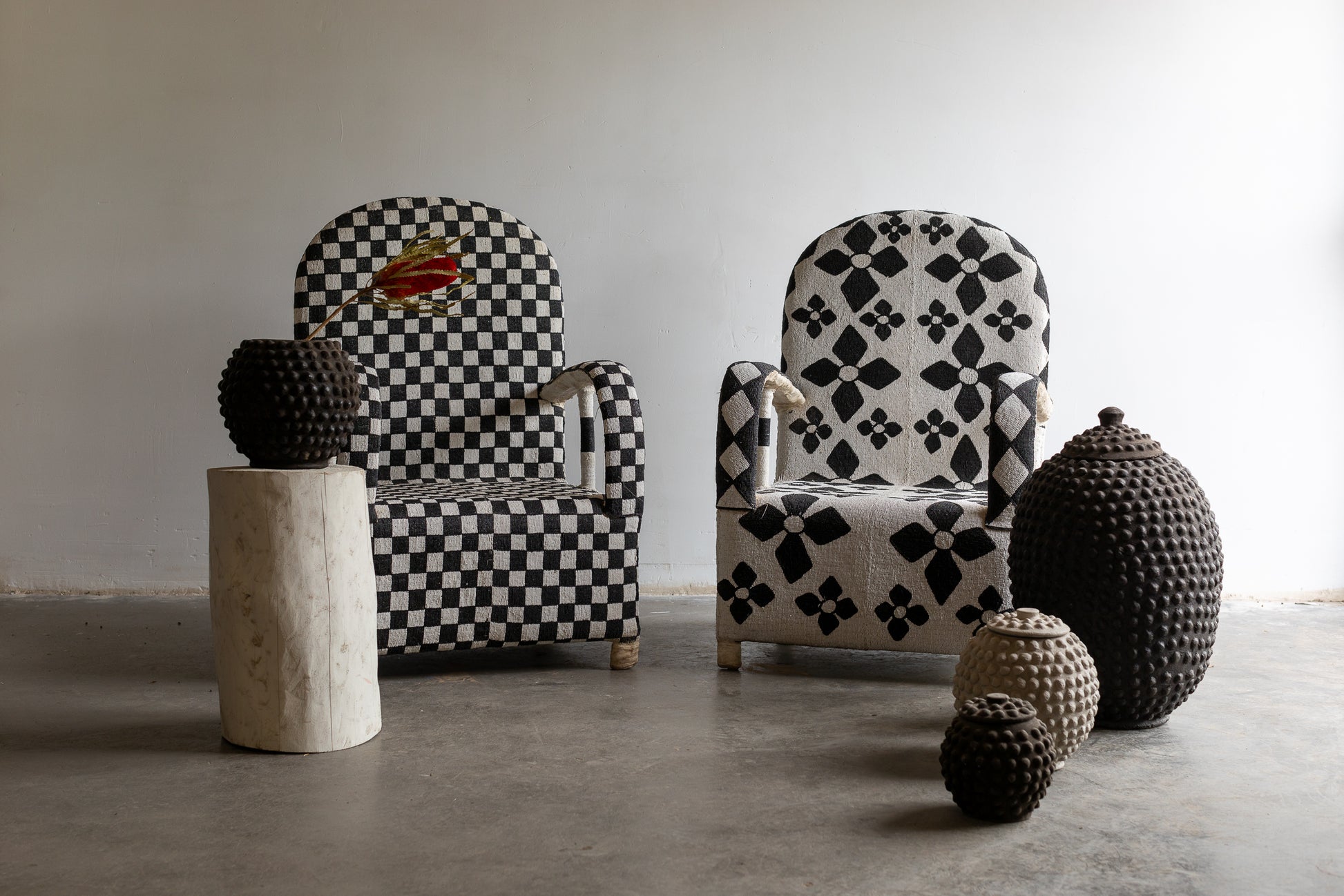 Originally handcrafted for the kings and queens of the Nigerian Yoruba Tribe , each chair takes approximately 3 months to make. Thousands of tiny glass beads are intricately applied on canvas fabric in beautiful shapes and designs. The fabric is then attached and sewn to the frame of the chair. A meticulous process that results in an elaborate and unique work of art.