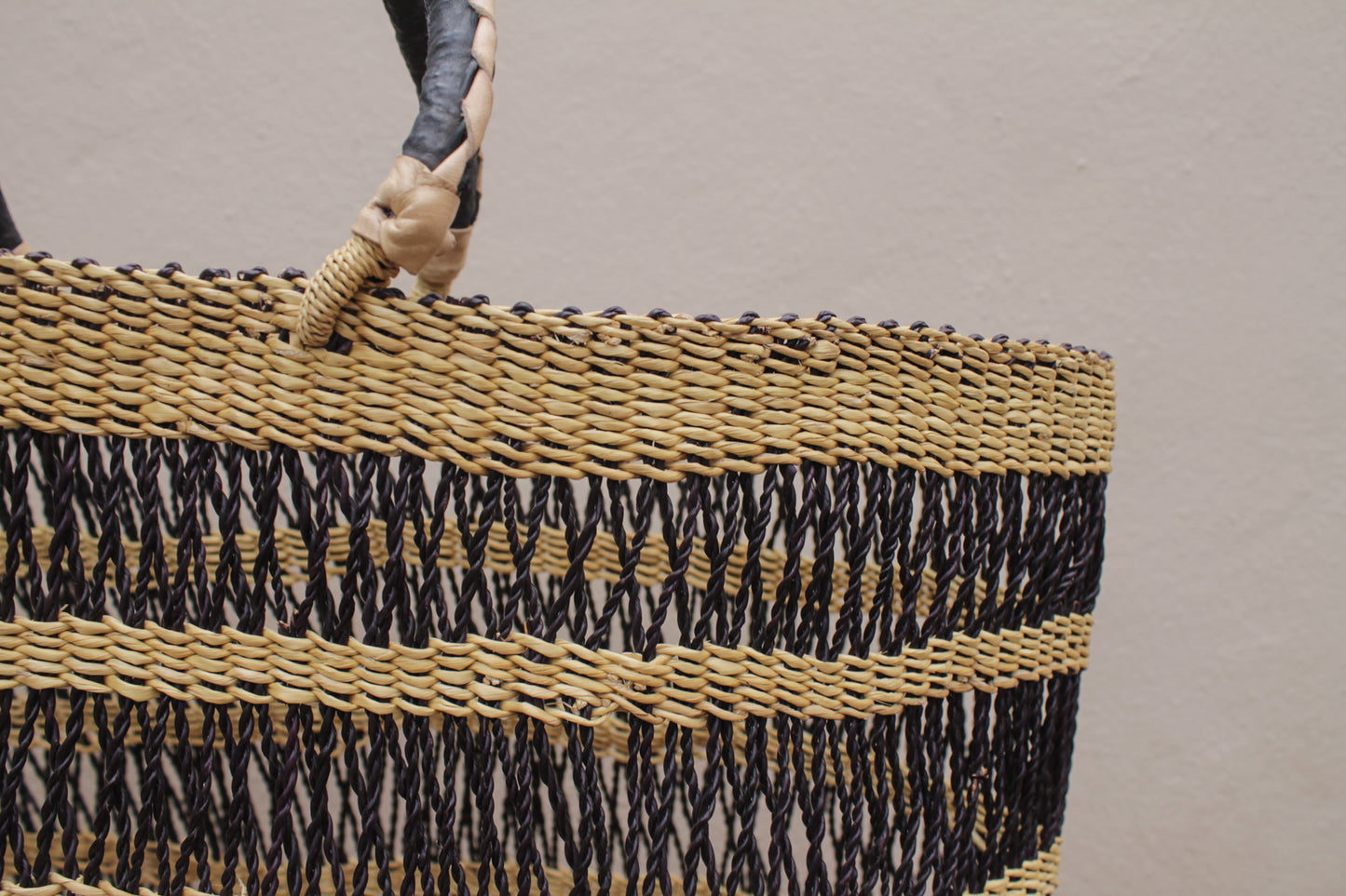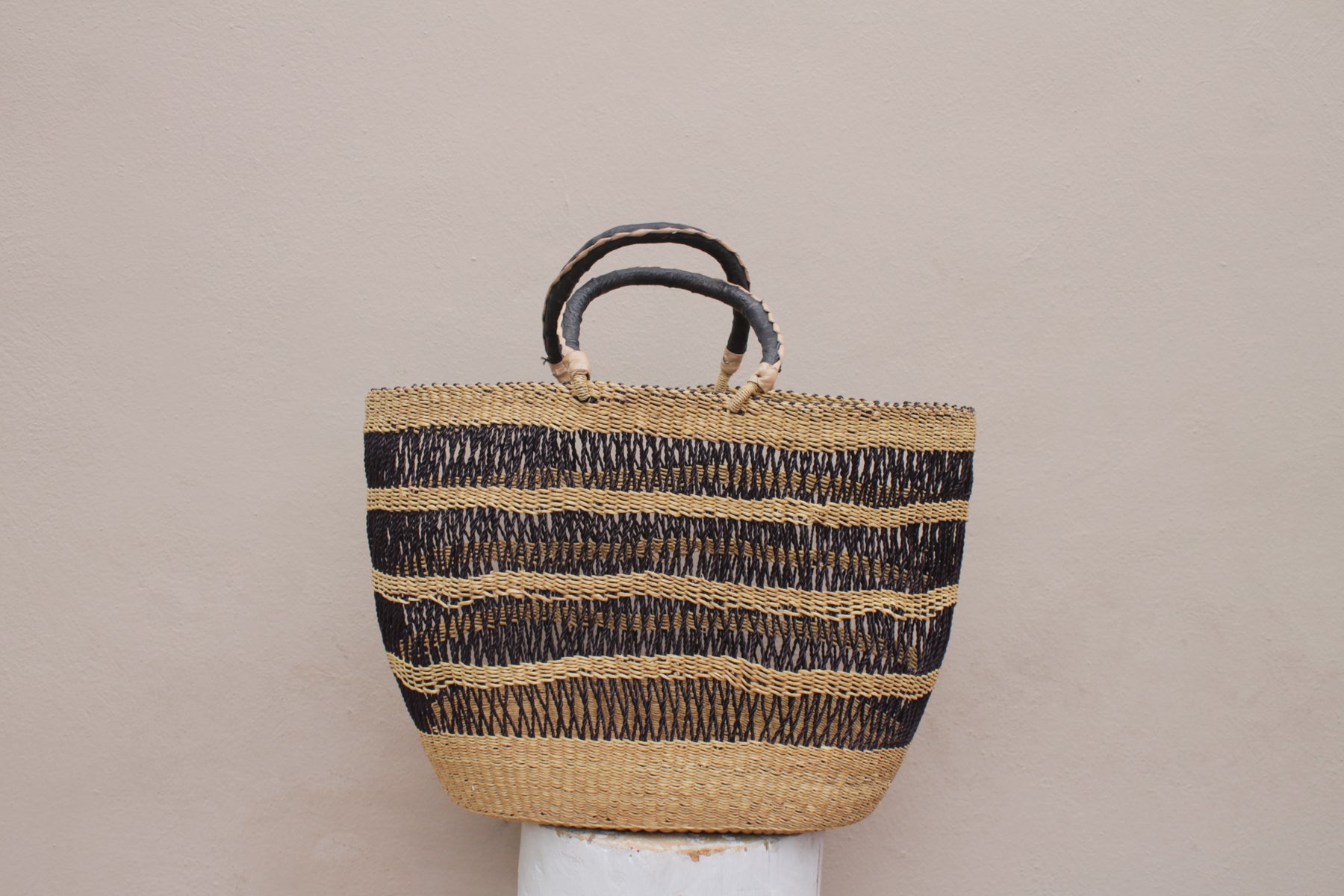 Sans aucun doute l’un de nos best-sellers lorsqu’il arrive à temps. Il s'agit d'un panier tissé par des artisanes de la ville de Bolgatanga, au Ghana. Il est tissé à la main avec de l'herbe à éléphant, une variété d'herbe rustique qui est teinte pour créer ces motifs colorés.