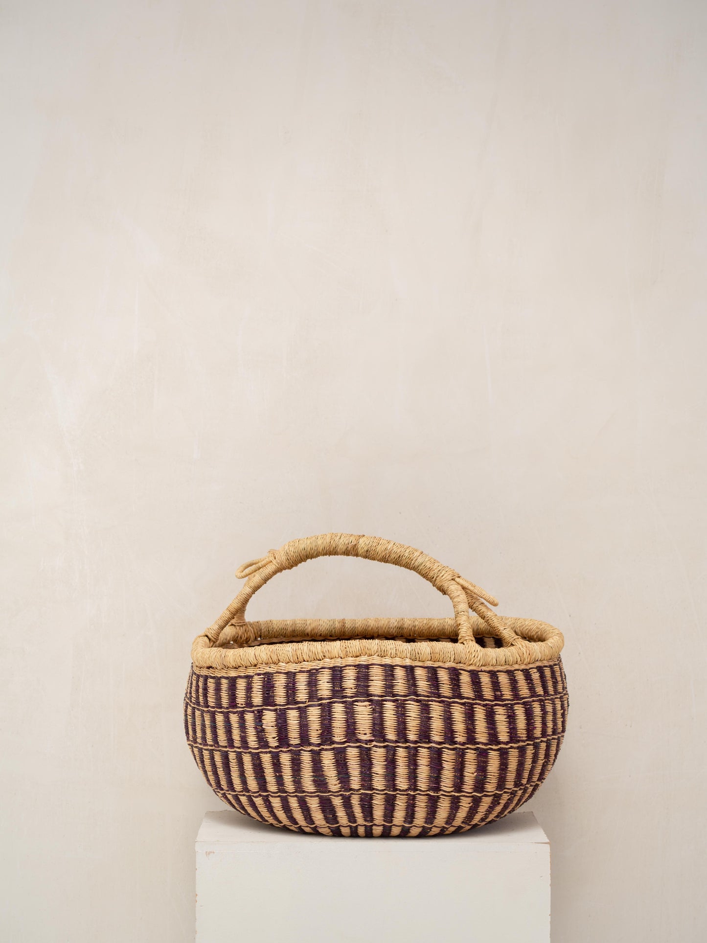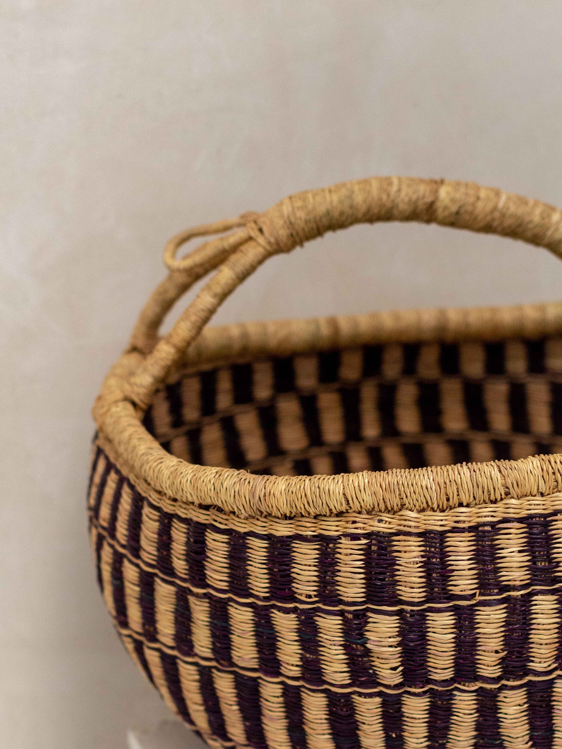 Panier à deux anses colorées importé directement de Bolgatanga, Ghana. Il est tissé à la main avec de l'herbe à éléphant, une variété d'herbe rustique qui est teinte pour créer ces motifs colorés.