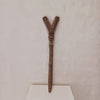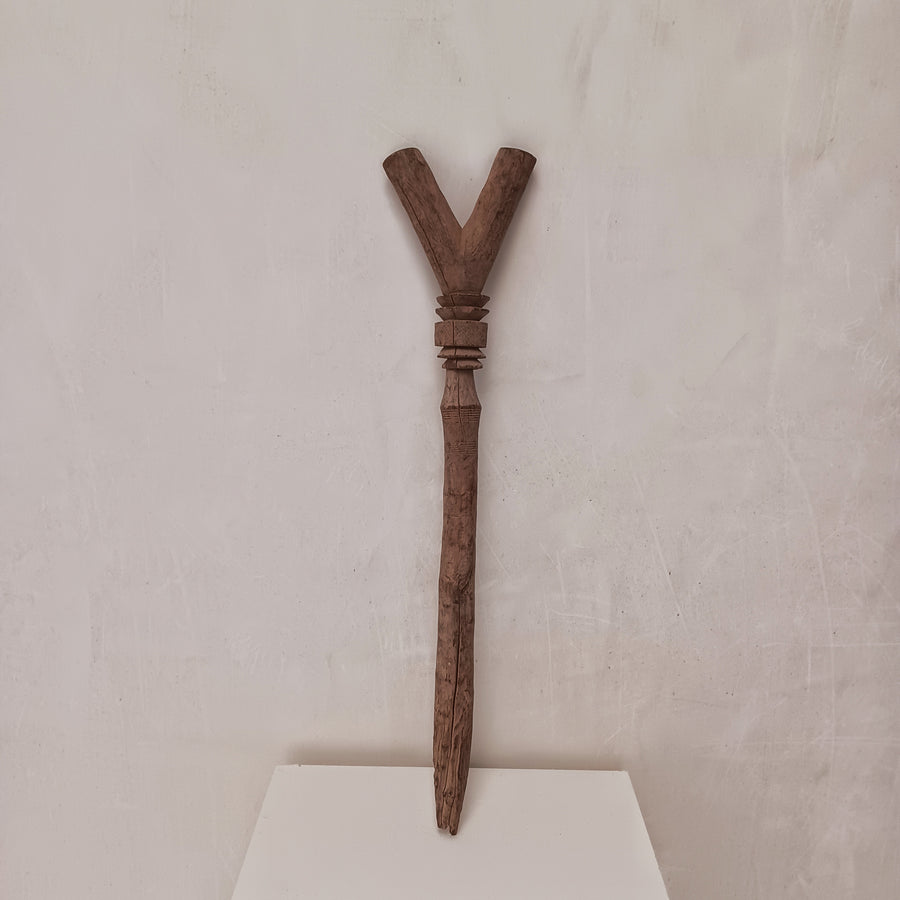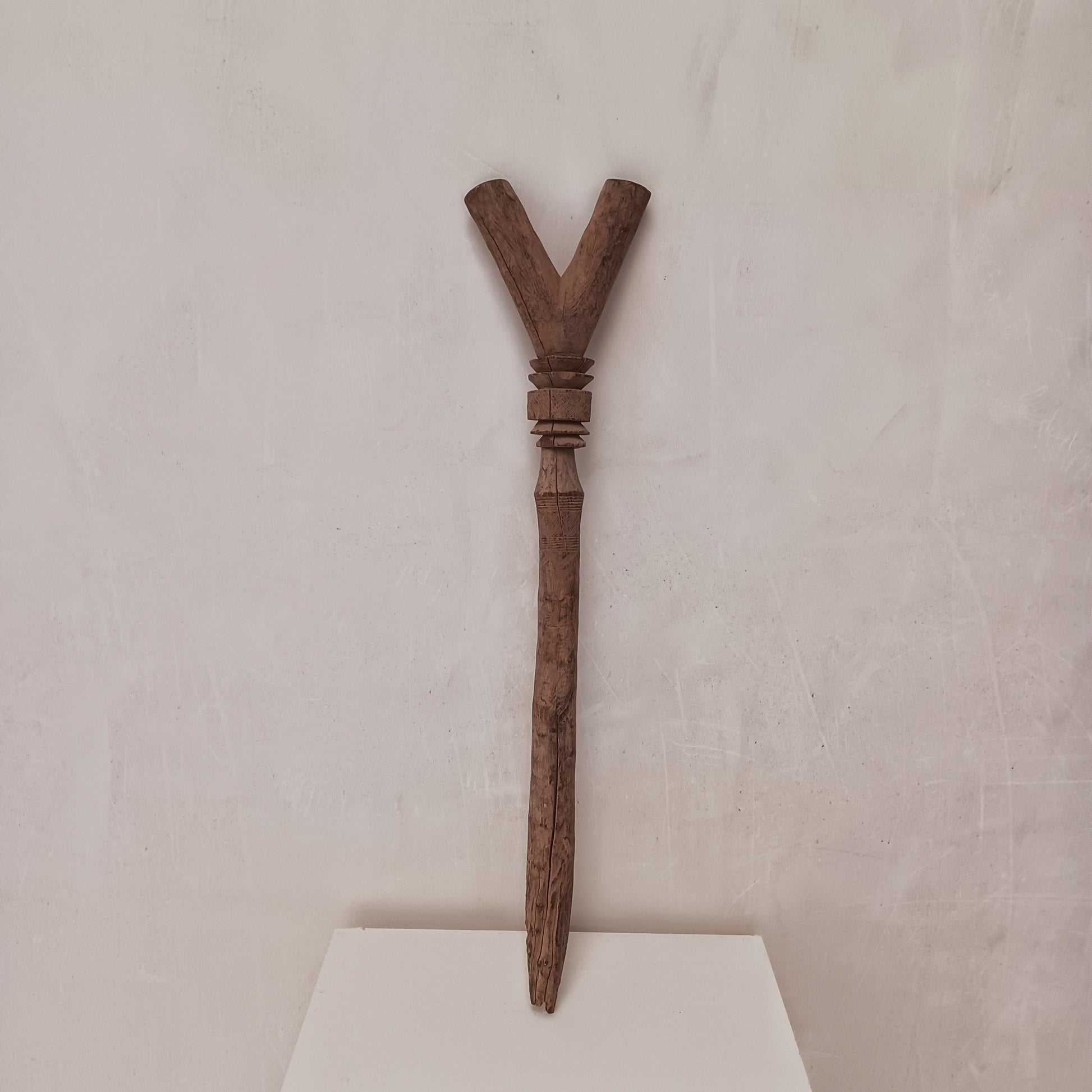 Ancien mât de tente des Touaregs du Mali. Ces poteaux servaient à ancrer les tentes au terrain du Sahara, c'est pourquoi la base de la canne est corrodée en raison de son séjour prolongé dans le sable. Le plateau est sculpté et sculpté. La conception en canne vous permet d'accrocher des ustensiles, des sacs, de la nourriture, etc. pour les éloigner des sols sableux.