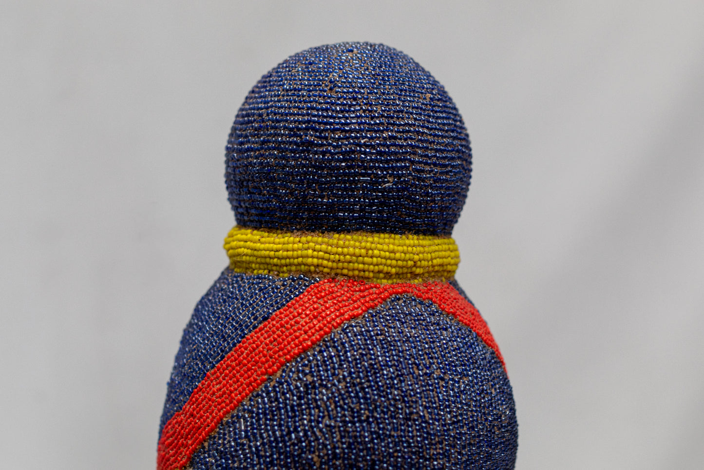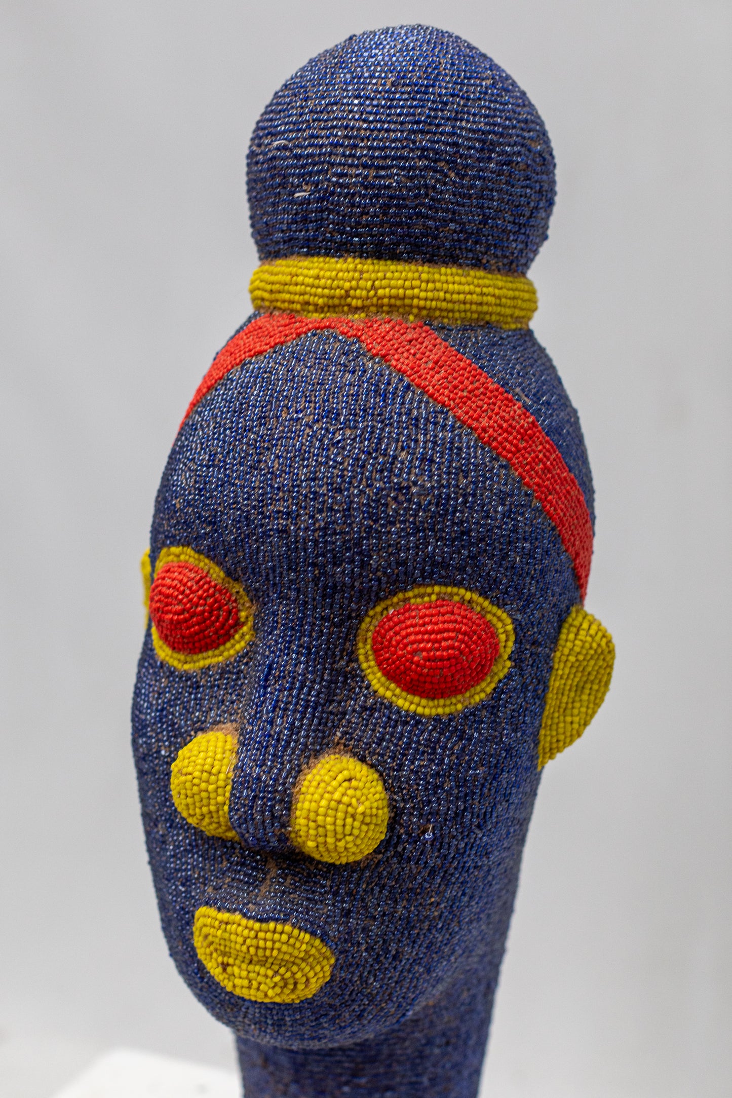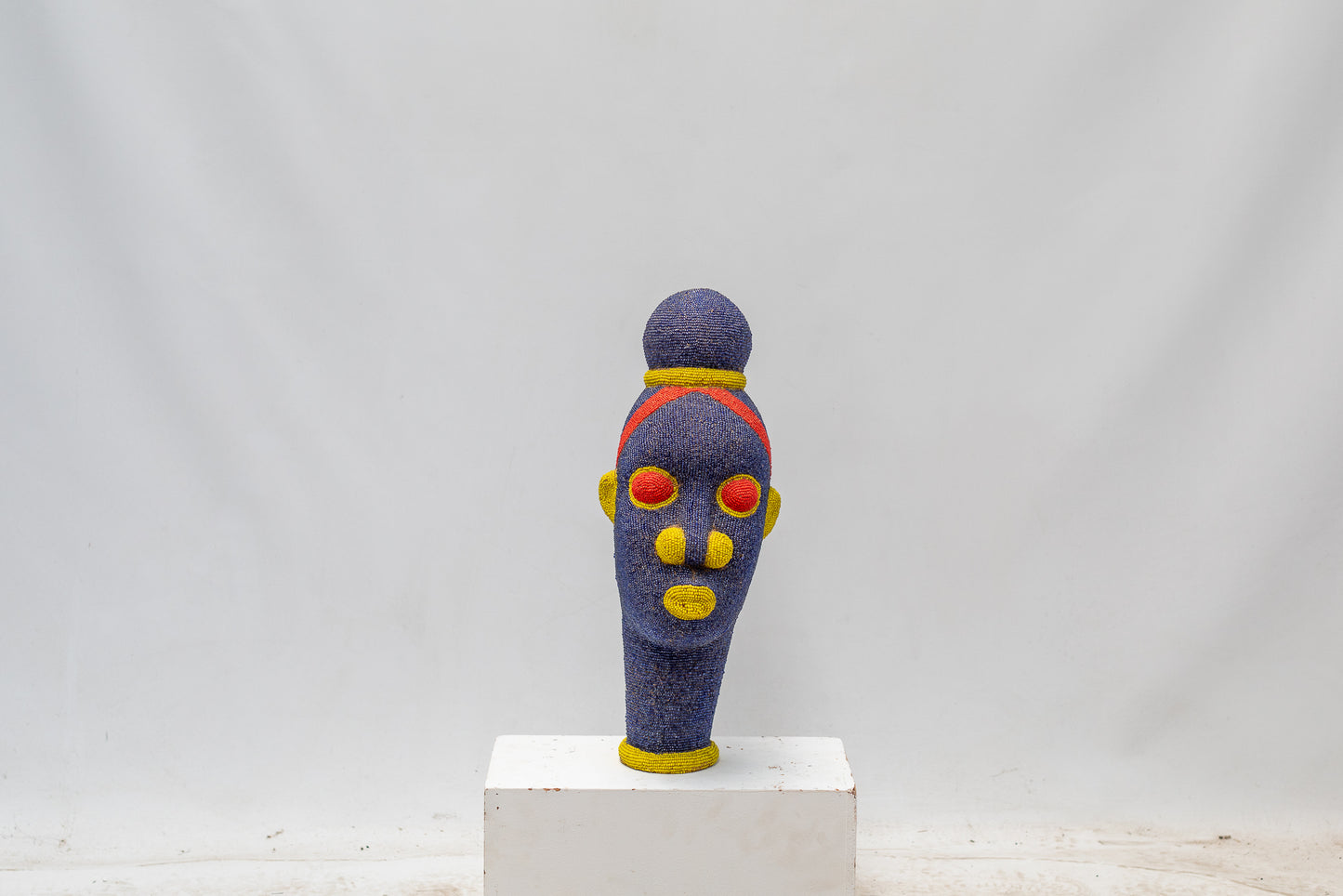 Realizada en Camerún con la técnica decorativa tradicional de las cuentas de vidrio multicolores, esta cabeza reproduce las famosas efigies de los soberanos. Meticulosamente aplicadas sobre una superficie de terracota, las cuentas acentúan los rasgos y el tocado real con colores contrastados.