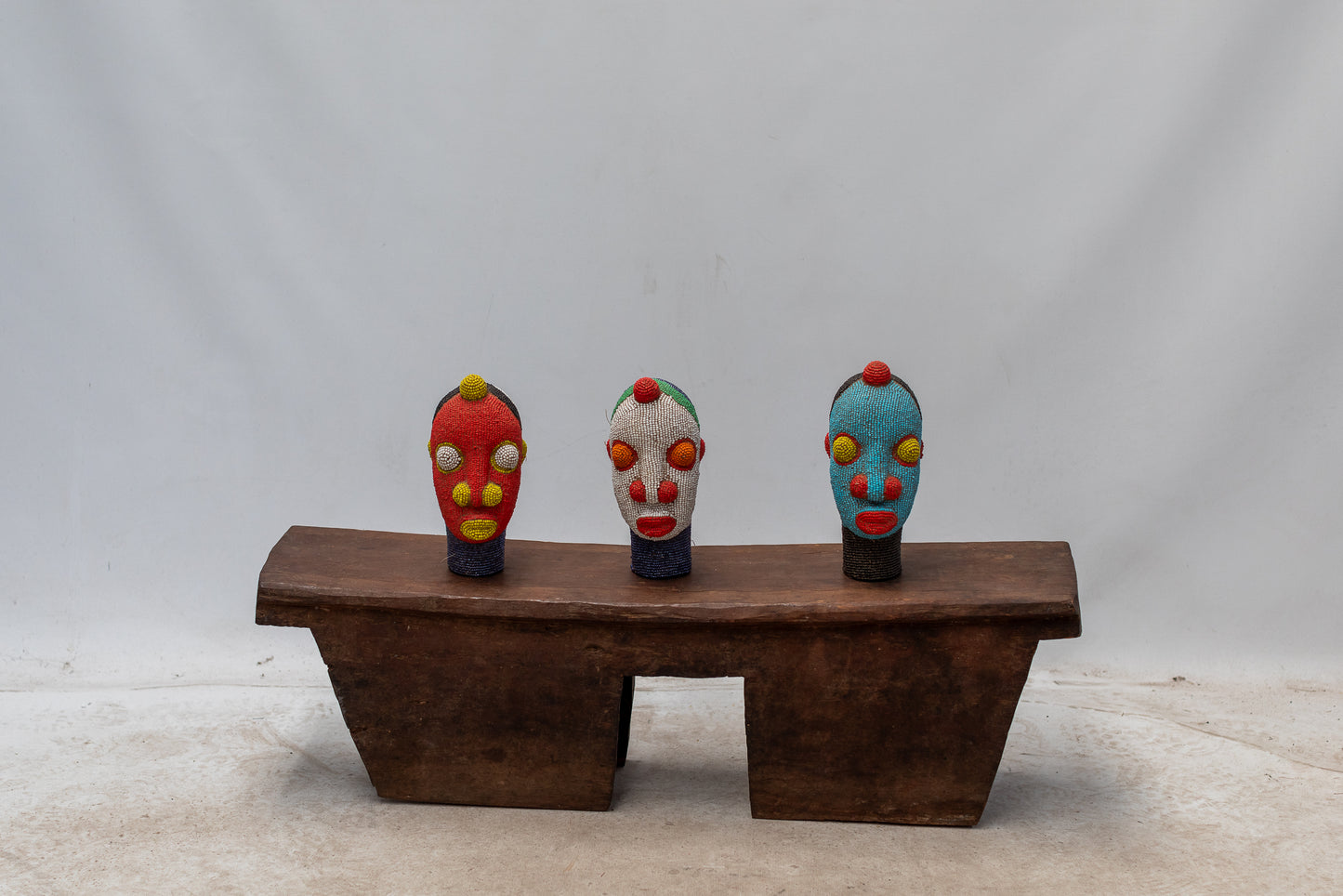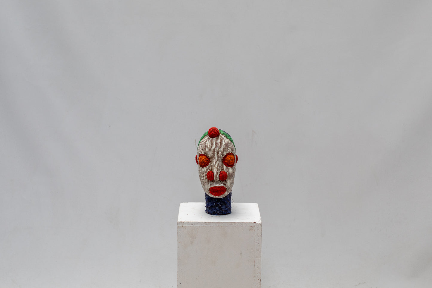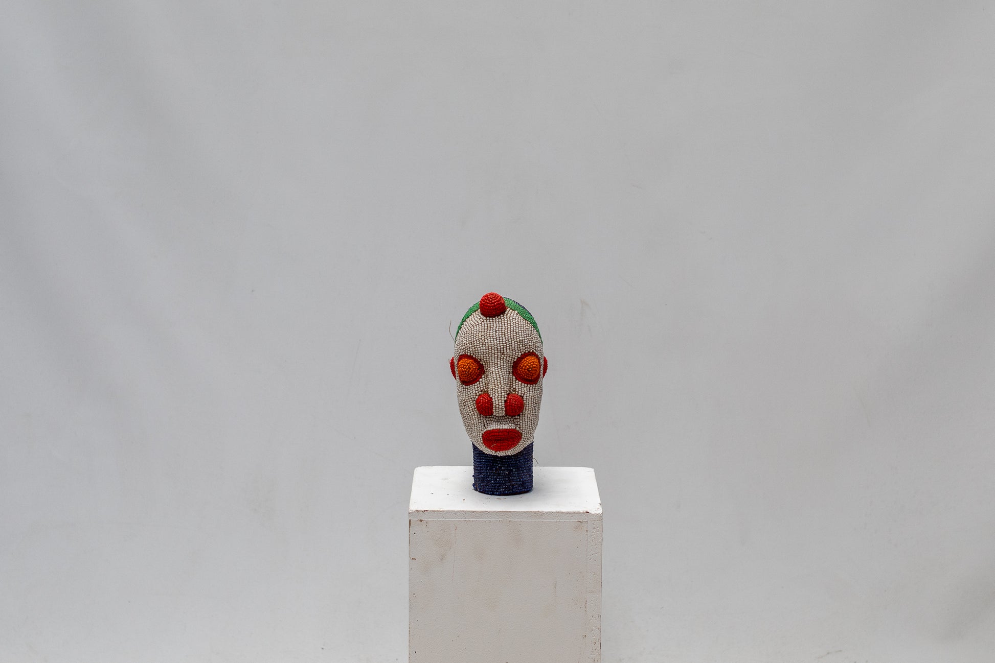 Realizada en Camerún con la técnica decorativa tradicional de las cuentas de vidrio multicolores, esta cabeza reproduce las famosas efigies de los soberanos. Meticulosamente aplicadas sobre una superficie de terracota, las cuentas acentúan los rasgos y el tocado real con colores contrastados.