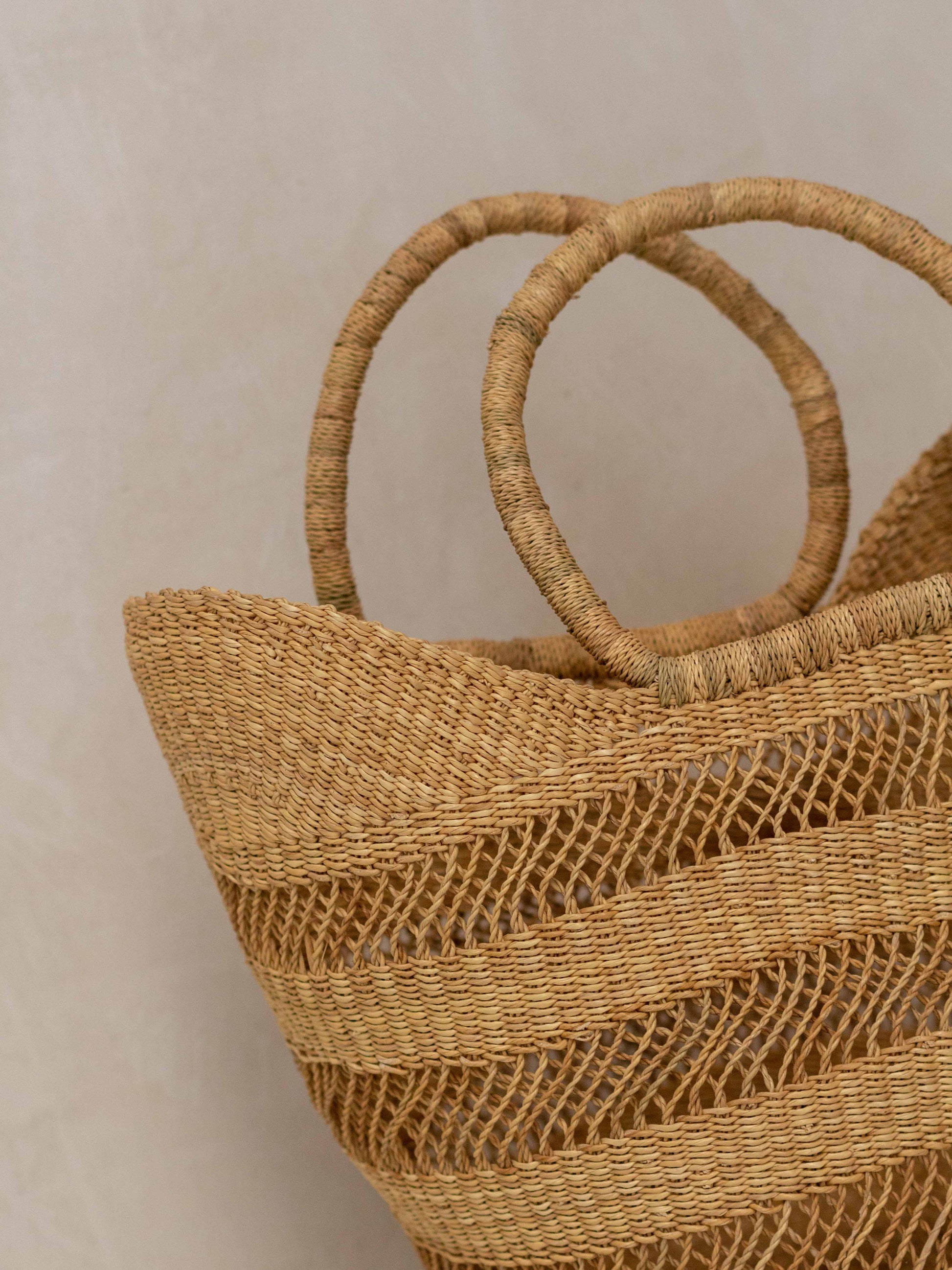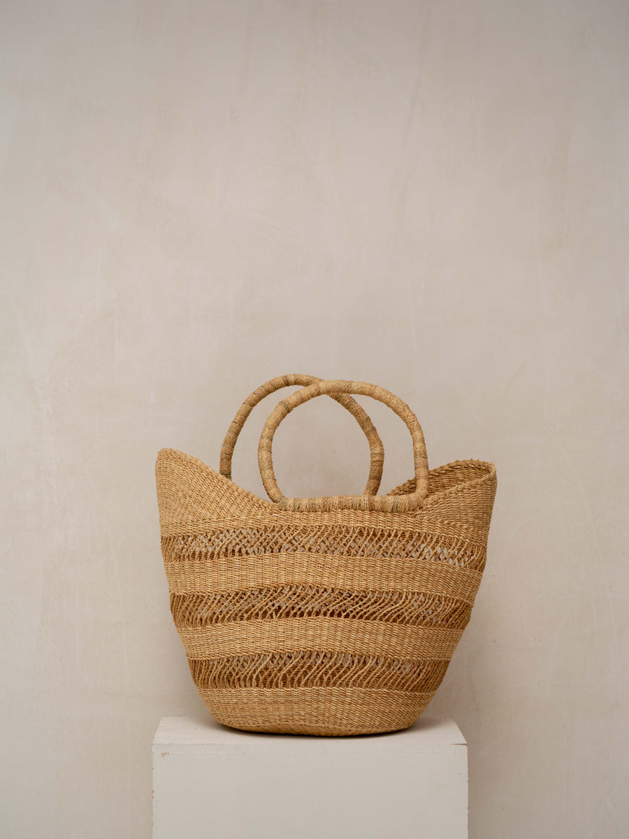 Sin duda uno de nuestros bestsellers cuando llega en buen tiempo. Se trata de un capazo tejido por mujeres artesanas en la ciudad de Bolgatanga, Ghana. Está tejido a mano en elephant grass o hierba de elefante, una variedad de pasto resistente que se tiñe para crear estos diseños tan coloridos.