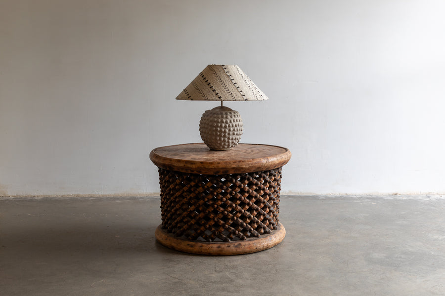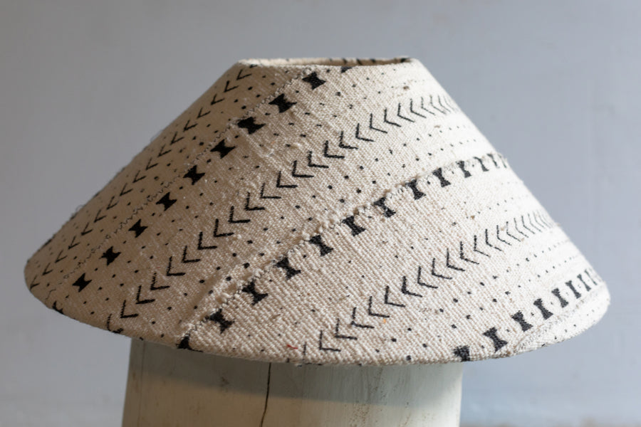 Todas nuestras pantallas están confeccionadas en España con nuestras telas africanas. Esta pantalla cilíndrica, está hecha con una tela bogolán. Este tipo de tejido se fabrica con tiras alargadas de algodón que son previamente tejidas de manera tradicional y después son cosidas unas con otras. Una vez finalizado, se cuece el tejido mezclándolo con hojas maceradas a modo de tinte vegetal.