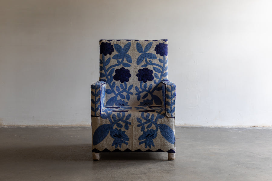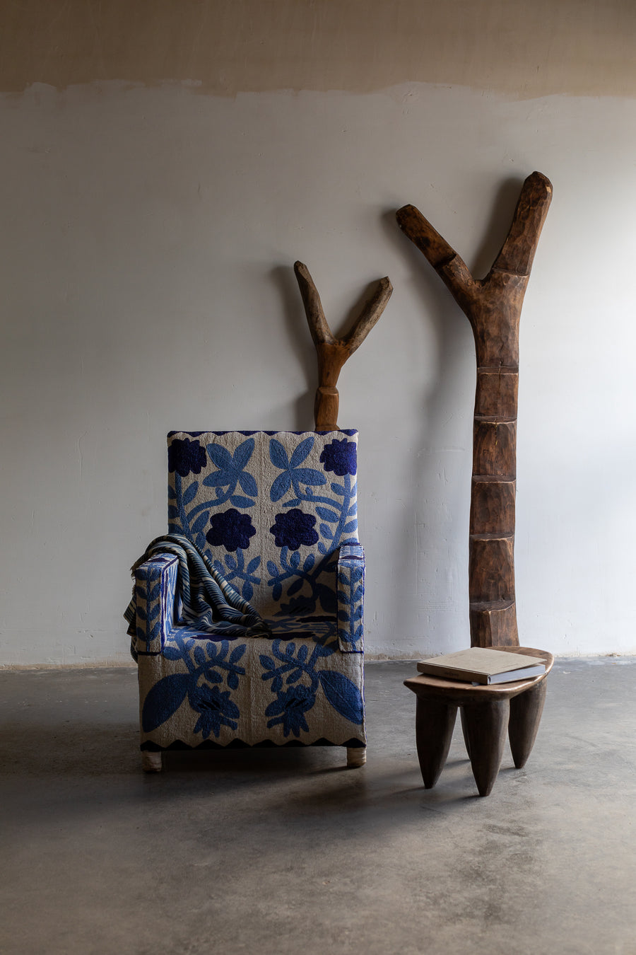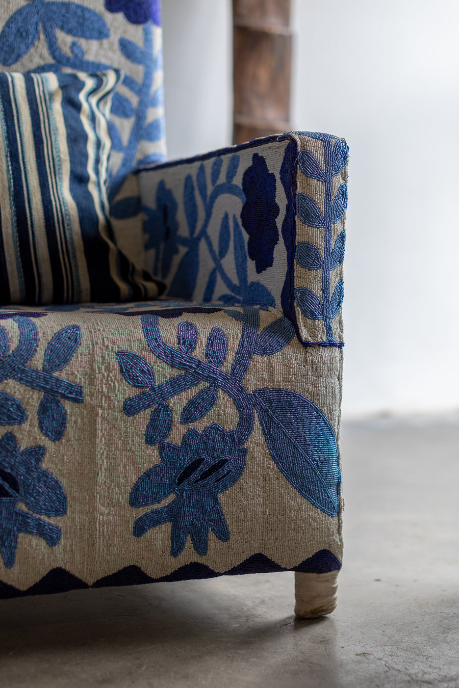 Fabricada originalmente a mano para los reyes y reinas de la Yoruba Tribe nigeriana, cada silla tarda aproximadamente 3 meses en fabricarse. Miles de minúsculas cuentas de cristal se aplican intrincadamente sobre tela de lienzo con bellas formas y diseños. A continuación, se fija la tela y se cose al armazón de la silla. Un proceso minucioso que da como resultado una obra de arte elaborada y única.
