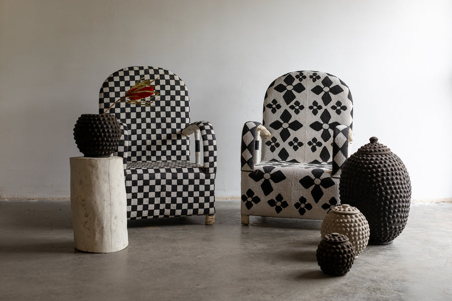Fabricada originalmente a mano para los reyes y reinas de la Yoruba Tribe nigeriana, cada silla tarda aproximadamente 3 meses en fabricarse. Miles de minúsculas cuentas de cristal se aplican intrincadamente sobre tela de lienzo con bellas formas y diseños. A continuación, se fija la tela y se cose al armazón de la silla. Un proceso minucioso que da como resultado una obra de arte elaborada y única.